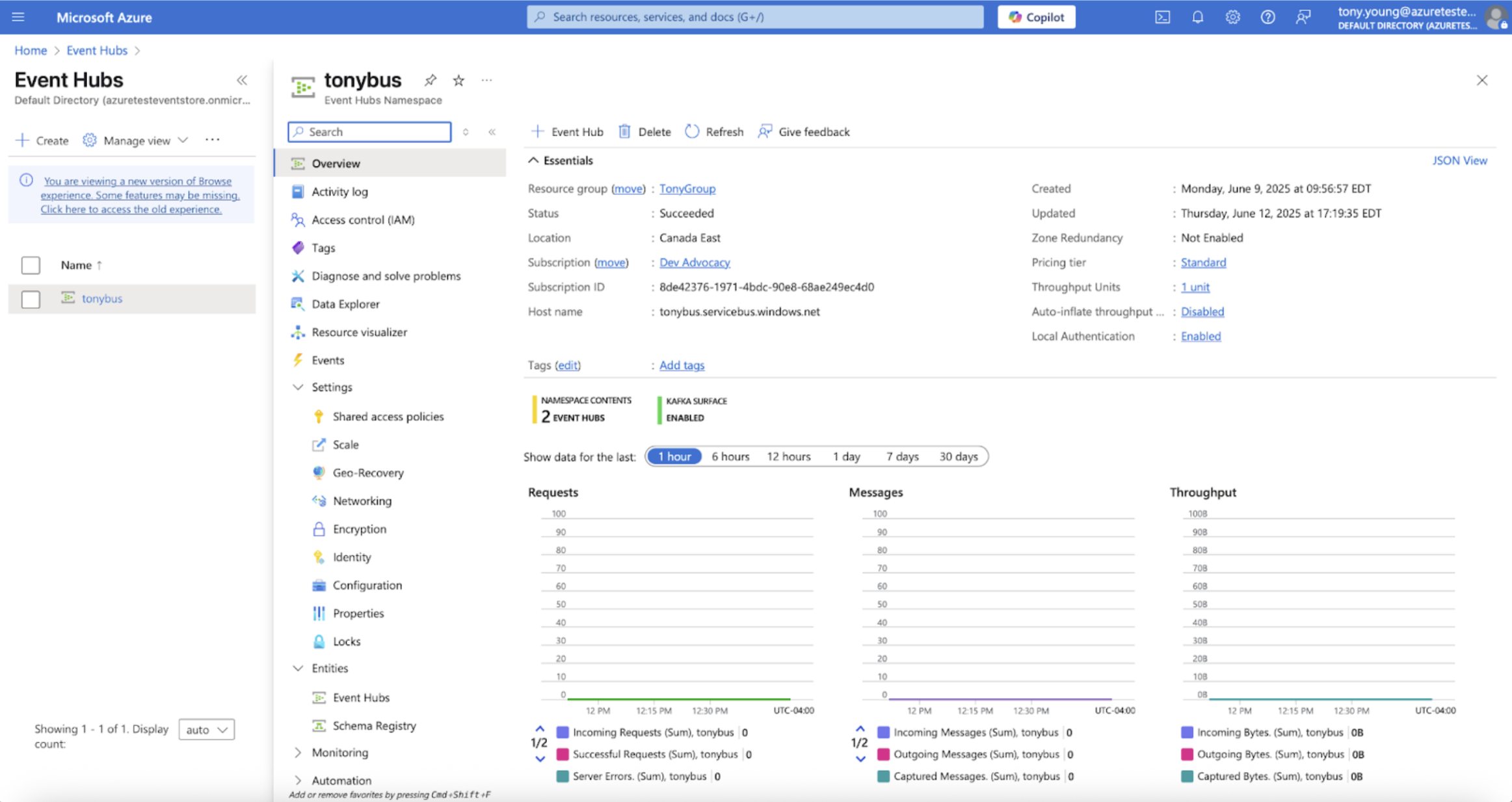 Many customers desire to send events from KurrentDB to Azure Event Hubs for dissemination to downstream applications and technologies. Since Azure Event Hubs provides a Kafka endpoint, integration with KurrentDB can easily be configured using our Kafka Connector Sink. This document outlines the steps necessary, and where to find the required information in the Azure control panel